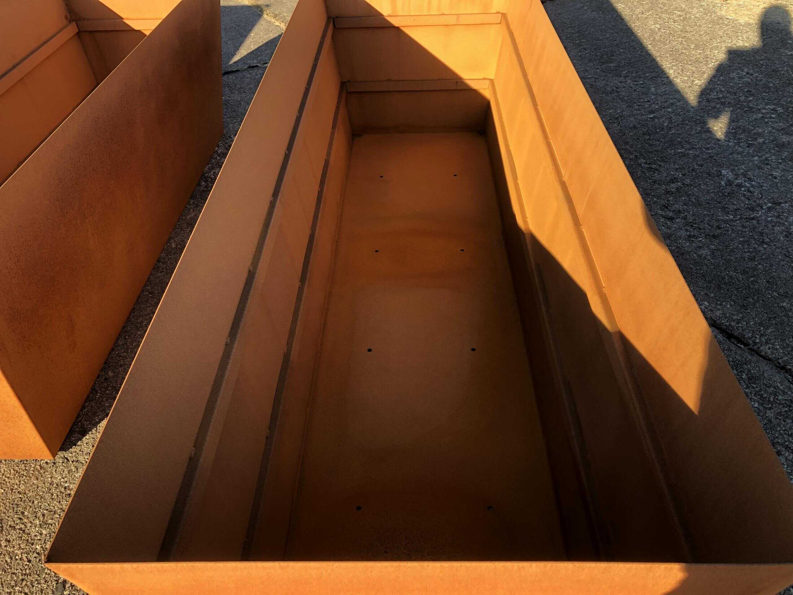 Plantekassen er lager i 2mm cortenstål som ruster. Cortenstål har den fantastiske egenskapen at rustet beskytter stålet. Det betyr at kassen vil vare mye lengre en vanlige stålkasser. Kassen leveres delvis rustet. Denne kassen er helsveist og med forsterkninger på innsiden, slik at den holder formen. Fantastisk bra plantekasse som bare blir finere med tiden.
