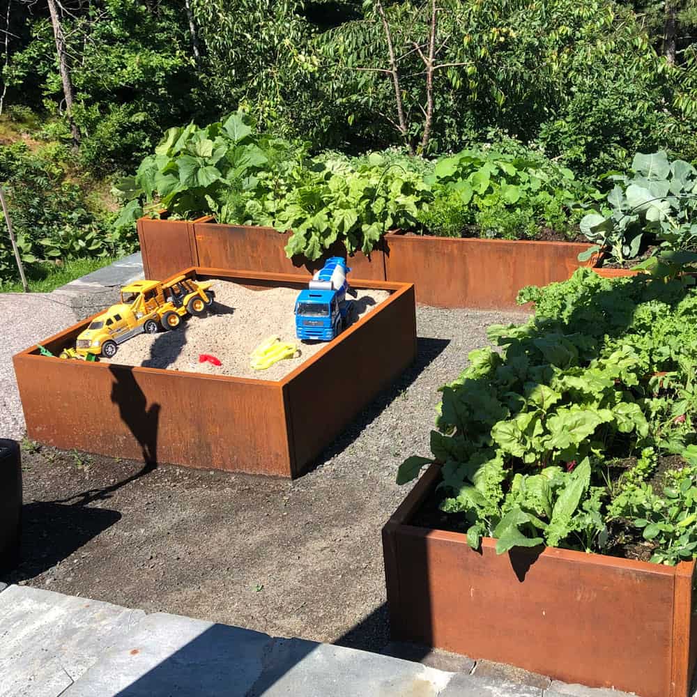 Cortenstål har den egenskapen at den ruster. Rusten legger seg som en beskyttende hinne på stålet som gjør at stålet ruster svært langsomt. Denne plantekassen vil vare i mange år eller tiår.