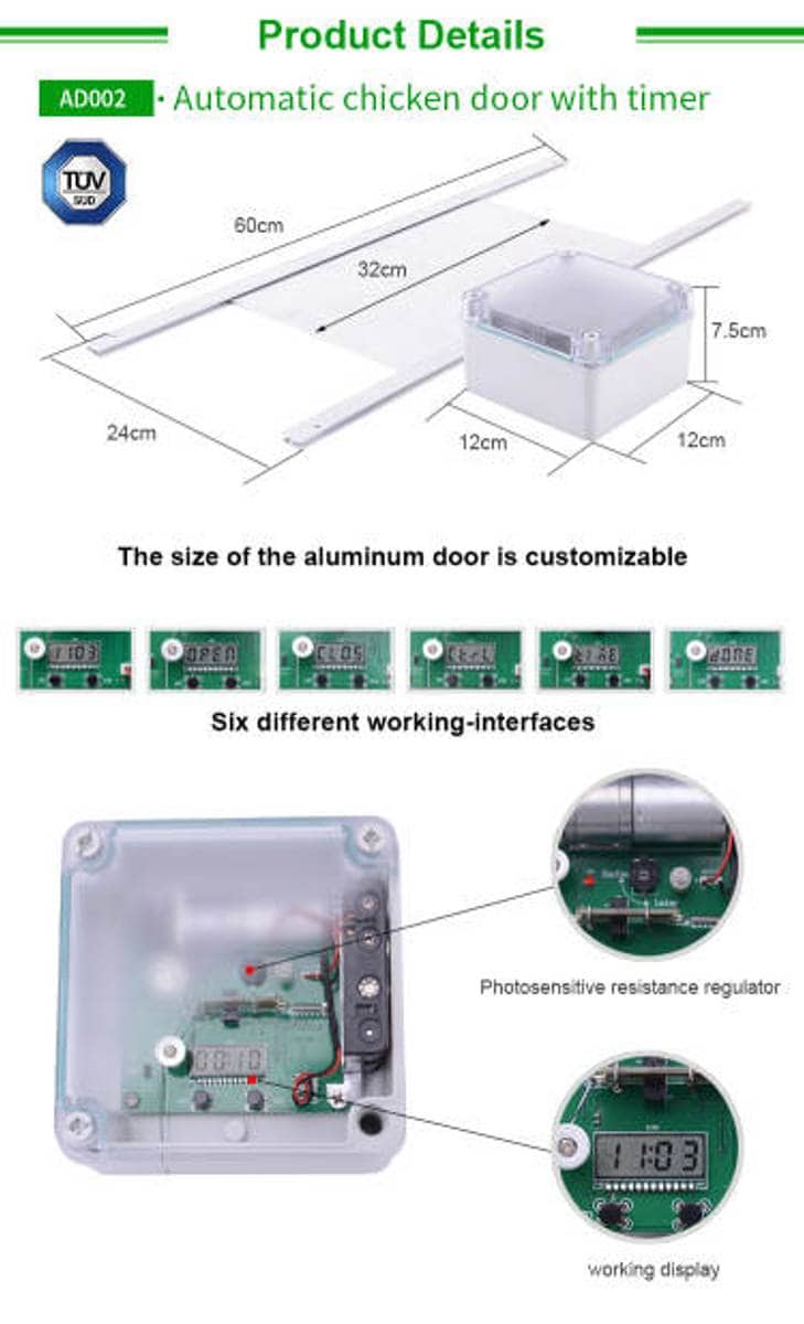 Døråpneren for kyllinghus virker på to måter, eller kombinerer de to måtene. Den virker på lysfølsomhet eller klokkeslett. Noe som betyr at en har den valgfriheten en ønsker. Hønseluken kan henges utendørs. Luken er inkludert i prisen.