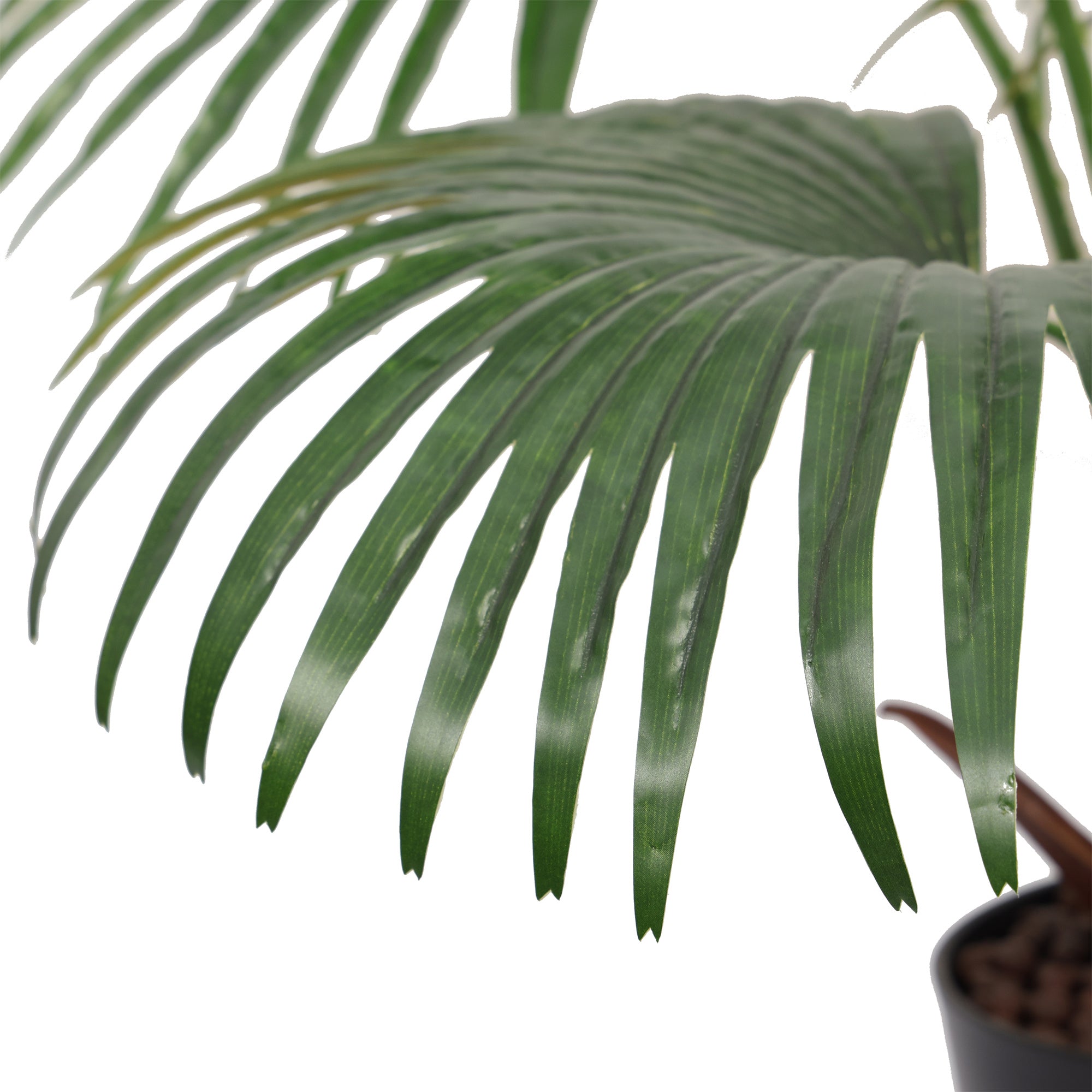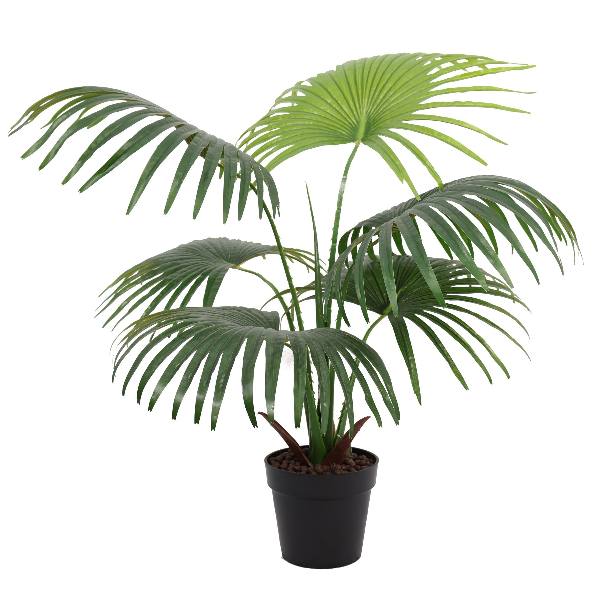 Vil du skape en lett tropisk stemning uten å fylle rommet? Denne 90 cm høye viftepalmen gjør jobben med et rent og moderne uttrykk, og passer like godt ved sofaen som i et hjørne på kontoret. Den leveres med potte (8”) og er klar til plassering med én gang.